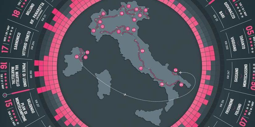 The Giro is starting with a Team-Time-Trial in Belfast, Ireland. This year’s Cima Coppi (the summit with the highest altitude reached by cyclists during the Giro d’Italia) will be Passo dello Stelvio, at stage 16. Stage 16 also includes the Passo di Gavia climb. And this year, after 2011, the Monte Zoncolan is back (stage 20).